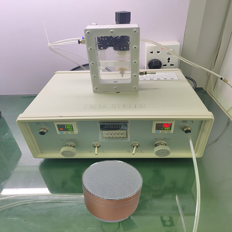為了達到檢測不同類型、不同大小的藍牙音響,戈埃爾科技采用間接檢測的方式來進行檢查。制作一個與產品仿行的模具,把產品放到模具內部。然后對模具充入一定量的氣體。讓氣體在產品的外圍形成一定的壓力。通過判斷產品外圍壓力的變化來對產品進行檢測。因檢測設備與測試治具是獨立的,所以上下模具是可以更換的,方便對多種型號的產品檢測。一方面模具具有保護功能,在檢測中能起到防刮花的作用。