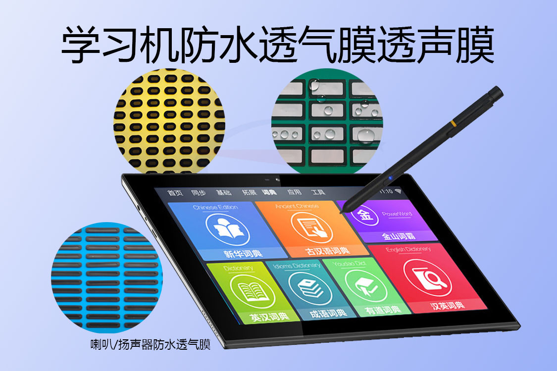一般來說,學(xué)習(xí)機(jī)做防水基本上在兩個方面,一是外殼結(jié)構(gòu)的防水(比如說上下殼體與TP觸摸屏與殼體屏幕框體等),二是電聲器件或者說電聲器件對應(yīng)的殼體透聲孔部位的防水,更進(jìn)一步的是對于PCB電路板也做防水,對于外殼結(jié)構(gòu)防水一般是采用防水密封圈或者采用防水密封膠點膠加工工藝來實現(xiàn)防水,對于電聲器件的防水,一般是在電聲器件對應(yīng)的透氣孔透聲孔部位安裝學(xué)習(xí)機(jī)防水透氣膜透聲膜來實現(xiàn)防水透氣透聲的,如果對于電路板的防水則是通過納米防水材料涂覆實現(xiàn)的。薄弱的環(huán)節(jié)在于學(xué)習(xí)機(jī)防水透氣膜透聲膜上,在學(xué)習(xí)機(jī)防水透氣膜透聲膜滿足防水標(biāo)準(zhǔn)并實測通過后,也就是說薄弱的學(xué)習(xí)機(jī)防水透氣膜透聲膜環(huán)節(jié)通過了,就說明學(xué)習(xí)機(jī)整機(jī)也是符合相應(yīng)的防水要求的。